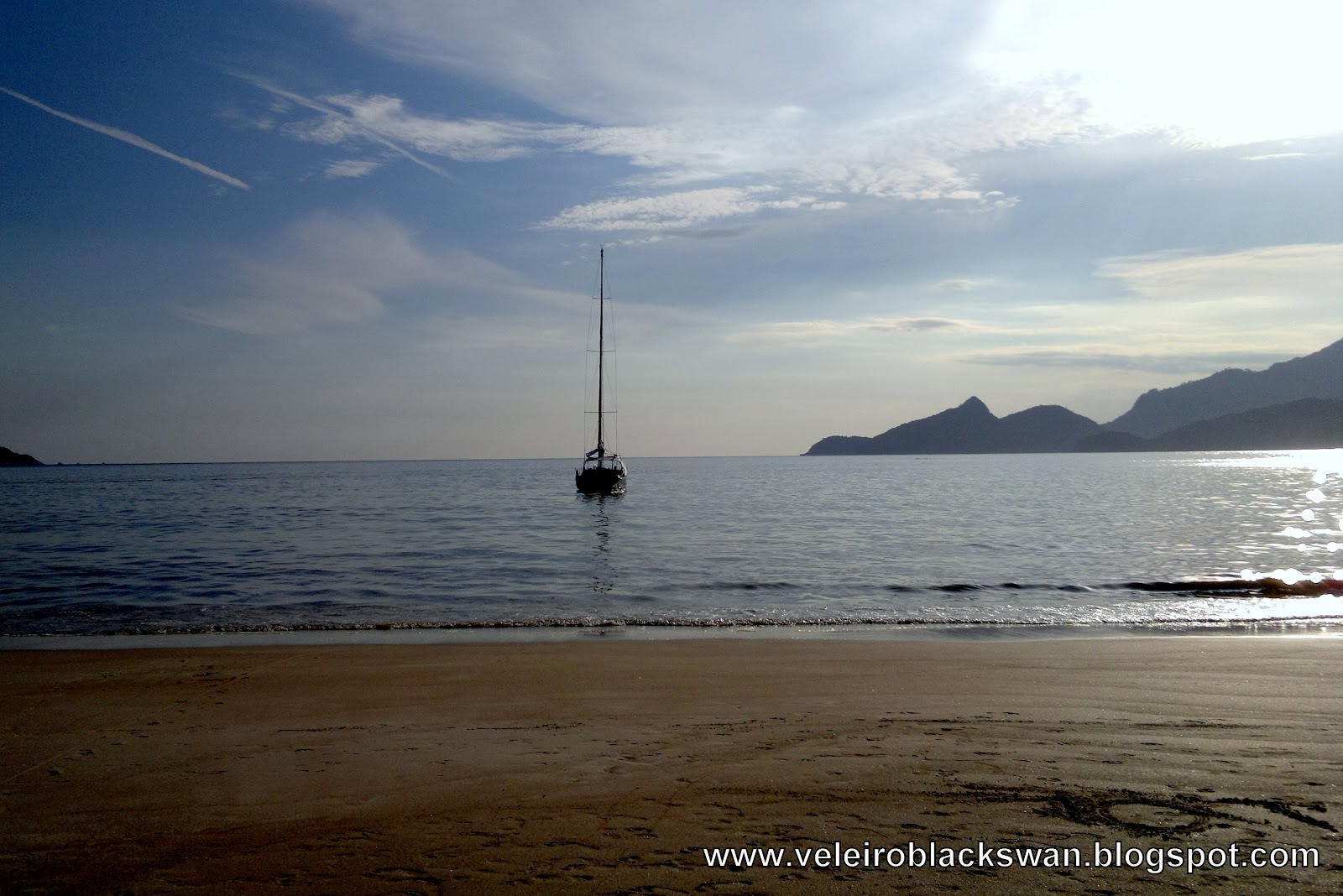 Mesmo assim, desconfiados, descemos âncora e a tripulação seguiu para terra... Os quatro... em um botinho mínimo!! Pareciam um "peru no pires"!! O Blackinho havia sido deixado em Paraty, pois, em viagens longas, o rapaizinho provoca uma certa perda na minha performance! Acho que chega a "roubar" um meio nó na minha velocidade! Isso, em percursos pequenos, não é nenhum problema, mas a viagem desta vez seria mais longa... Então veio o Blackinho Júnior... Ideal para um casal, e um mico total para os quatro juntos!! E foi assim, com as bundas molhadas e com com sério risco de virarem, que a tripulação chegou em terra! E eu lá, só me divertindo com a cena... rs